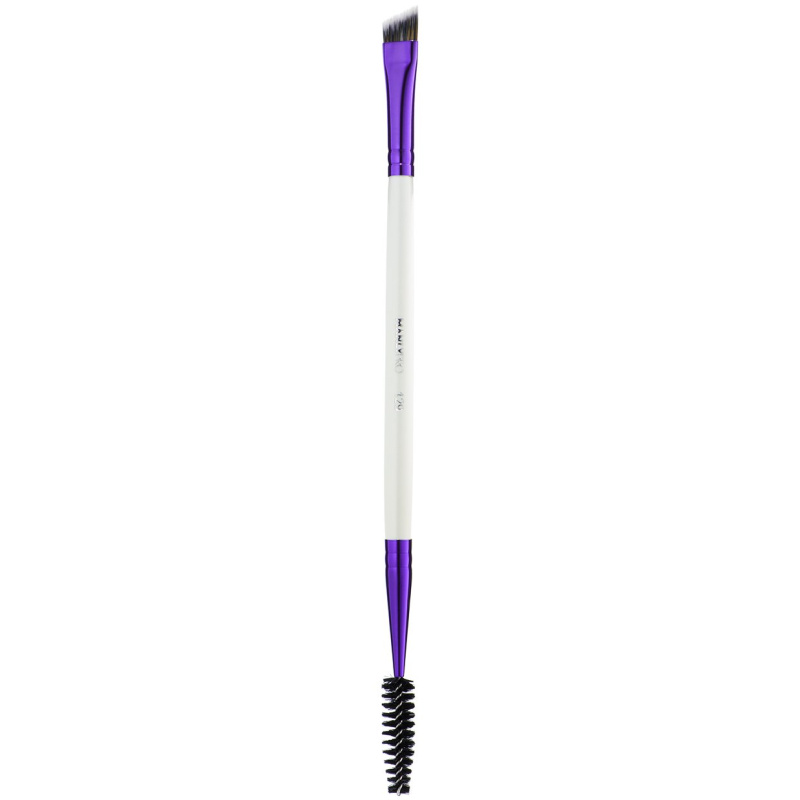 Удобная кисть, сочетающая в себе много функций: благодаря скошенной форме и тонкому краю, рисует идеально ровные графичные стрелки любого размера или прорисовывает четкую форму и отдельные волоски в макияже бровей. А удобная щеточка с другой стороны позволяет прочесать брови или ресницы, наносить тушь для ресниц, подкручивая и разделяя каждую ресничку, а также используется для создания формы бровей специальным воском для бровей MANLY PRO.